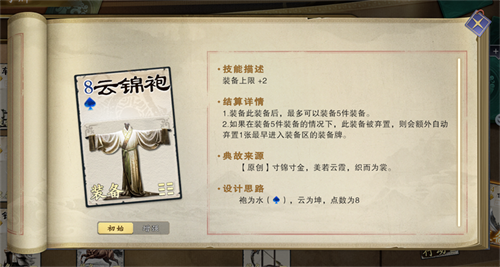 在装备云锦袍后,可增加2个装备上限。此装备如果被弃置,会自动弃置最早进入装备区的牌(所以当敌方多件装备时,可优先弃置其云锦袍)。